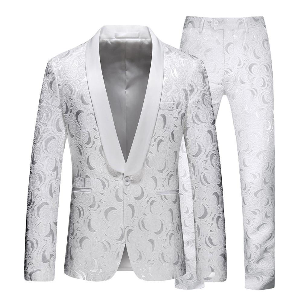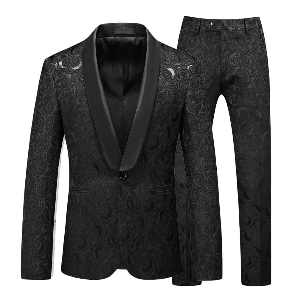 Woherb 2 Pieces Men's Tuxedo Suit Sets Jacquard Material Black White Retro Lapel Slimming Floral Wedding Clothing Man Suit with Pant