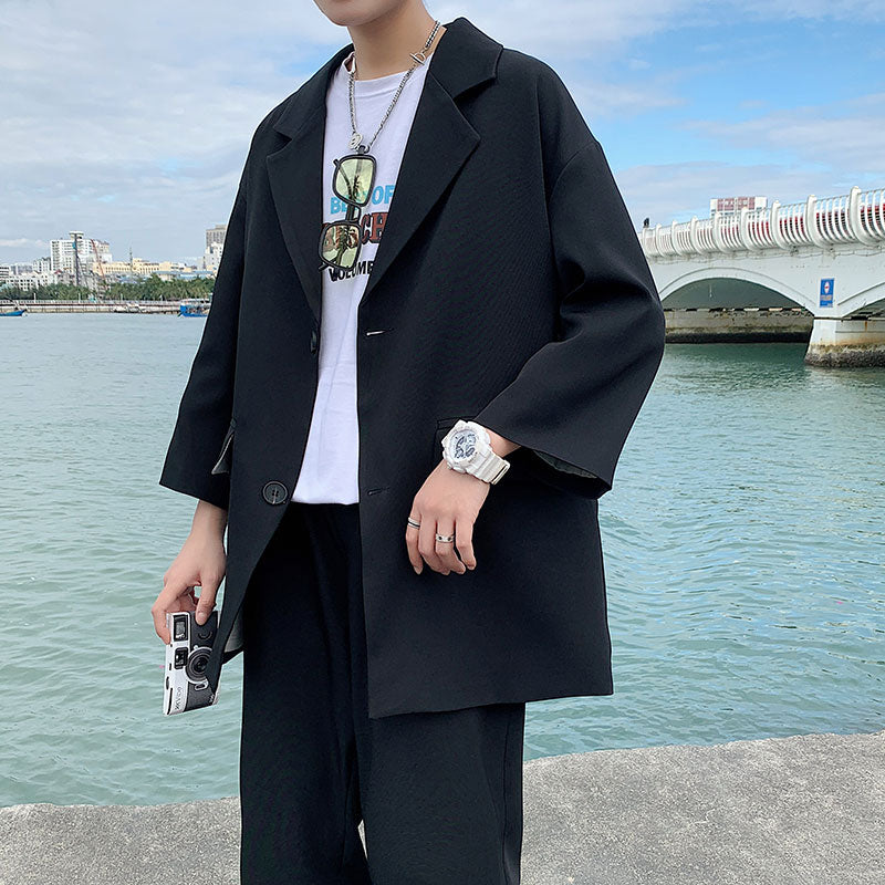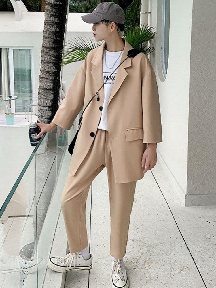 Woherb 2021 Fashion Men's Suit Three-quarter Sleeves Jacket Ankle-length Pant Black Khaki Baggy Casual Streetwear Summer Clothing Sets