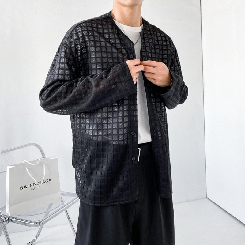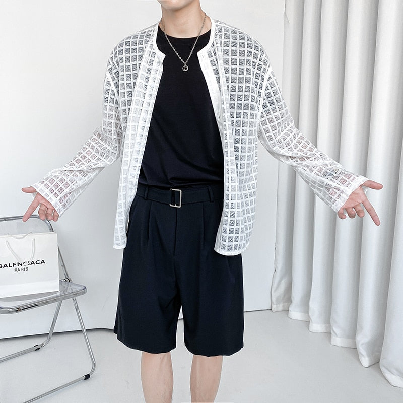 Woherb 2021 Stylish Summer Jacket Men Collarless Black White Plaid Mesh Breathable Sunscreen Coat Loose Ultra-thin Casual Clothing Man