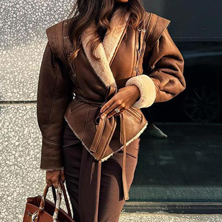 Woherb 2024 Suede Suede Jacket Lace-Up Jacket Fashion Vintage Female Autumn And Winter Short Warm Coat-Outfit Ideas