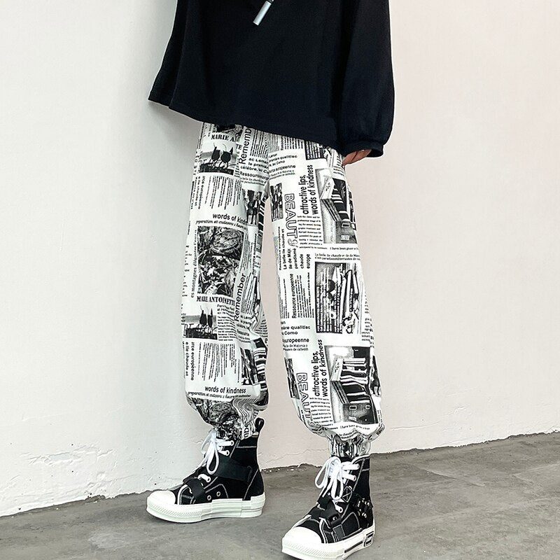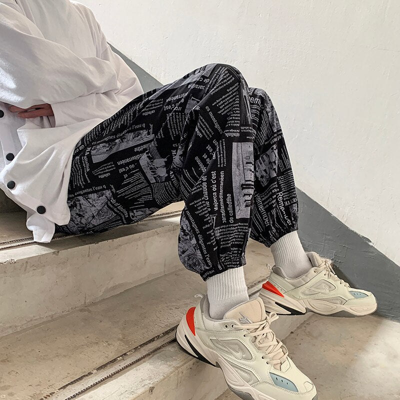 Woherb Harajuku Men's Harem Pants New Design Newspaper Printing Elastic Waist Loose Tapered Joggers Man Fashion Streetwear Clothing