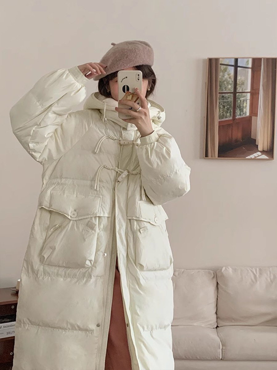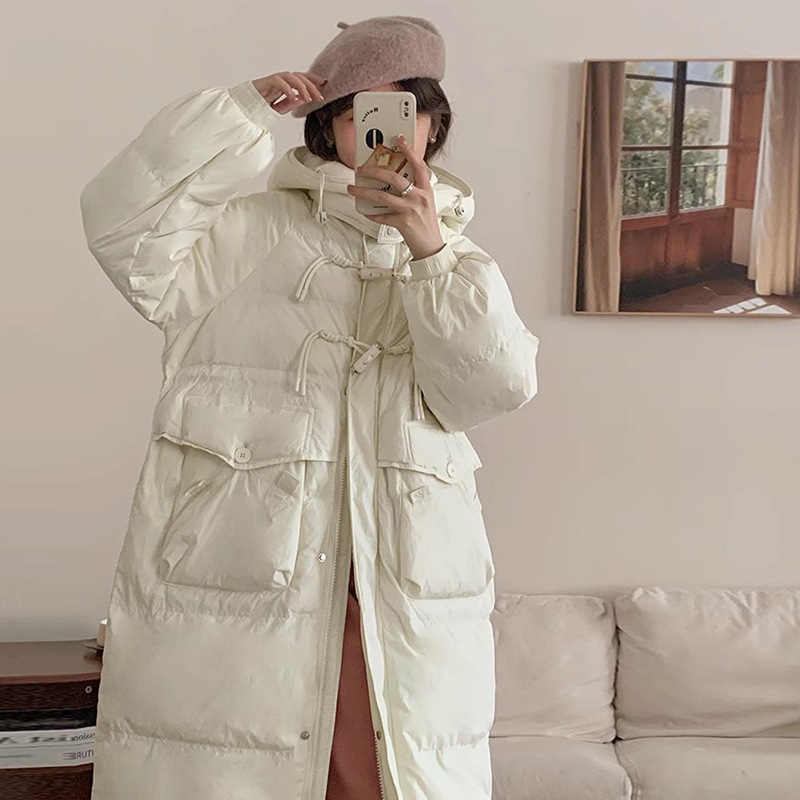 Woherb Korean Sweet Bamboo Buckle Down Jacket Female Long 2024 Winter New Hat Over The Knee Thick Warm Coat-Outfit Ideas