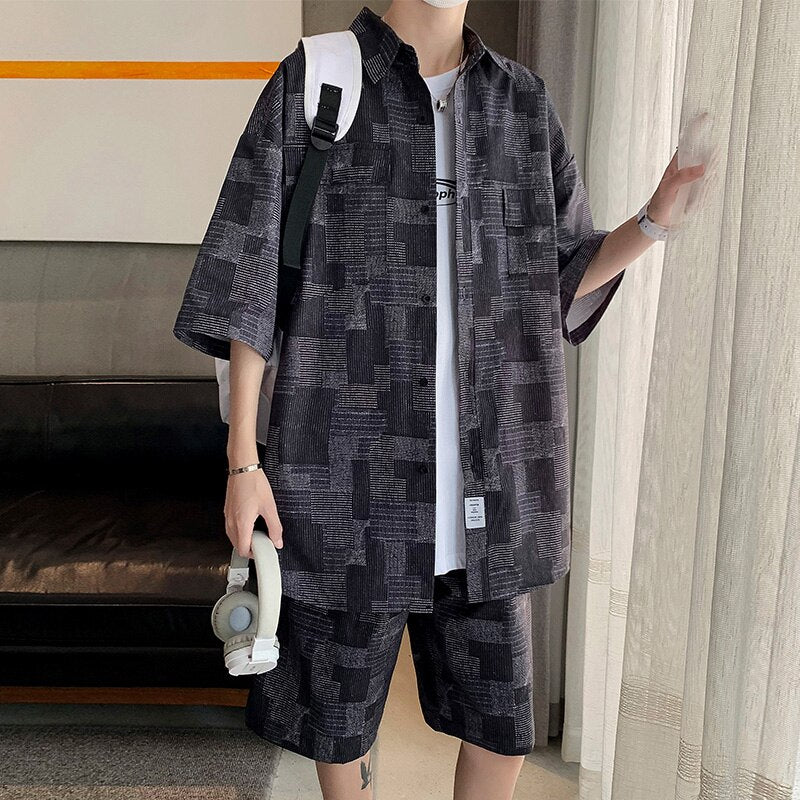 Woherb Summer Shorts Set Men Fashion Short Sleeve Shirt Suits Man Origin Design Patch Plaid Casual Oversized Clothing Black Blue 5XL