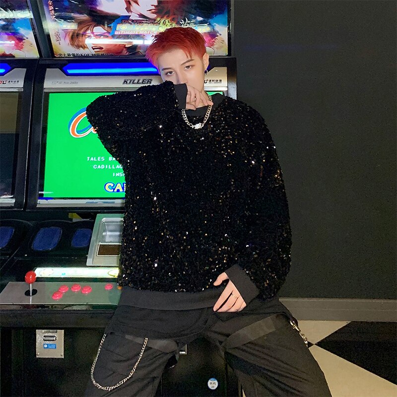 Woherb Twinkling Colors Sequins Men's Hoodies Sweatshirts Reflective Loose Hip-Hop Pullovers Singer Team Stage Christmas Party Tops
