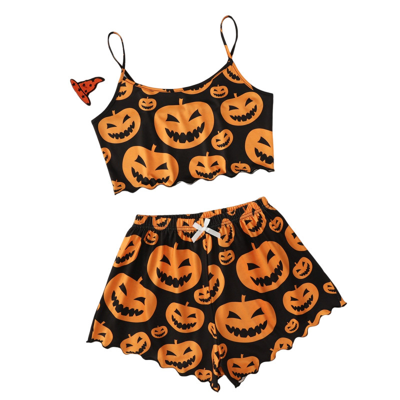 Woherb Woherb Funny Pumpkin Head Print Condole Top Sleeveless Home Clothes Pure Milk Silk Pajamas Girl Suit-Outfit Ideas