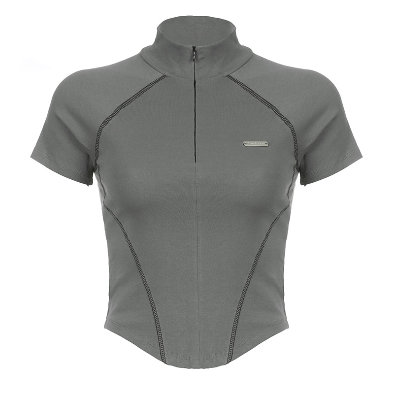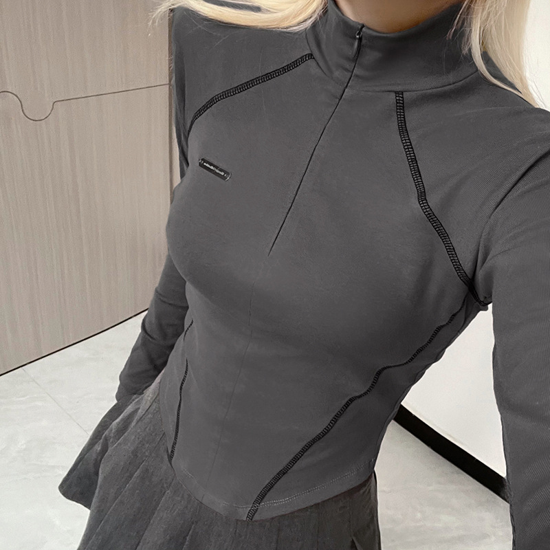 Woherb Woherb Spring 2023 New Spice Girl Stealth Zipper Stand Collar Bright Line Contrast Color Segmentation Slim Bottom T-Shirt-Outfit Ideas
