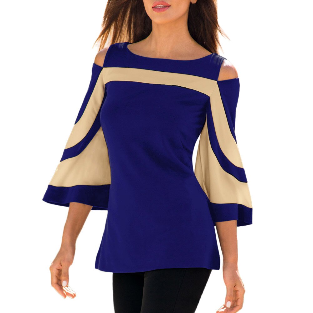 Women Blouse Cold Shoulder Long Sleeve O Neck Patchwork Shirt Pullover Tops Blouse Shirt Casual Ladies Blouses Tops 2020