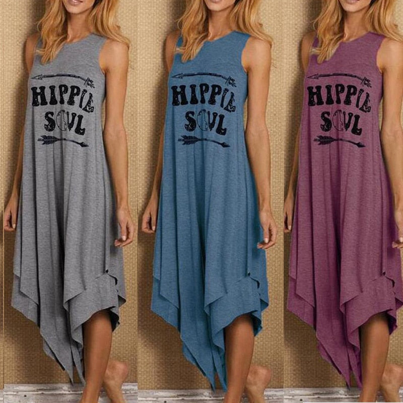 Women Casual Dress 2021 Summer Hippie Soul Letter Print Long Dress Loose Sleeveless O-Neck Double Layer Irregular Hem Maxi Dress