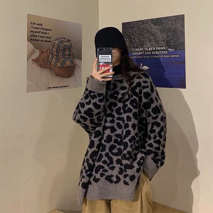 Women Leopard Pullovers Knitting Loose Harajuku Cool Girls Soft O-neck Trendy Slouchy Female Sweaters Teenagers High Quality Hot