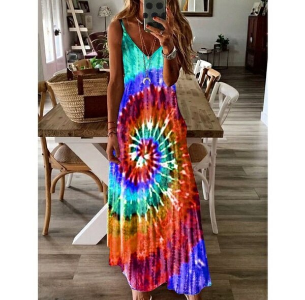 Women Rainbow Print Dress Casual Spaghetti Strap V-Neck Colorful Maxi Dress Sexy Tie Dyeing Printed Plus Size Female Long Dress