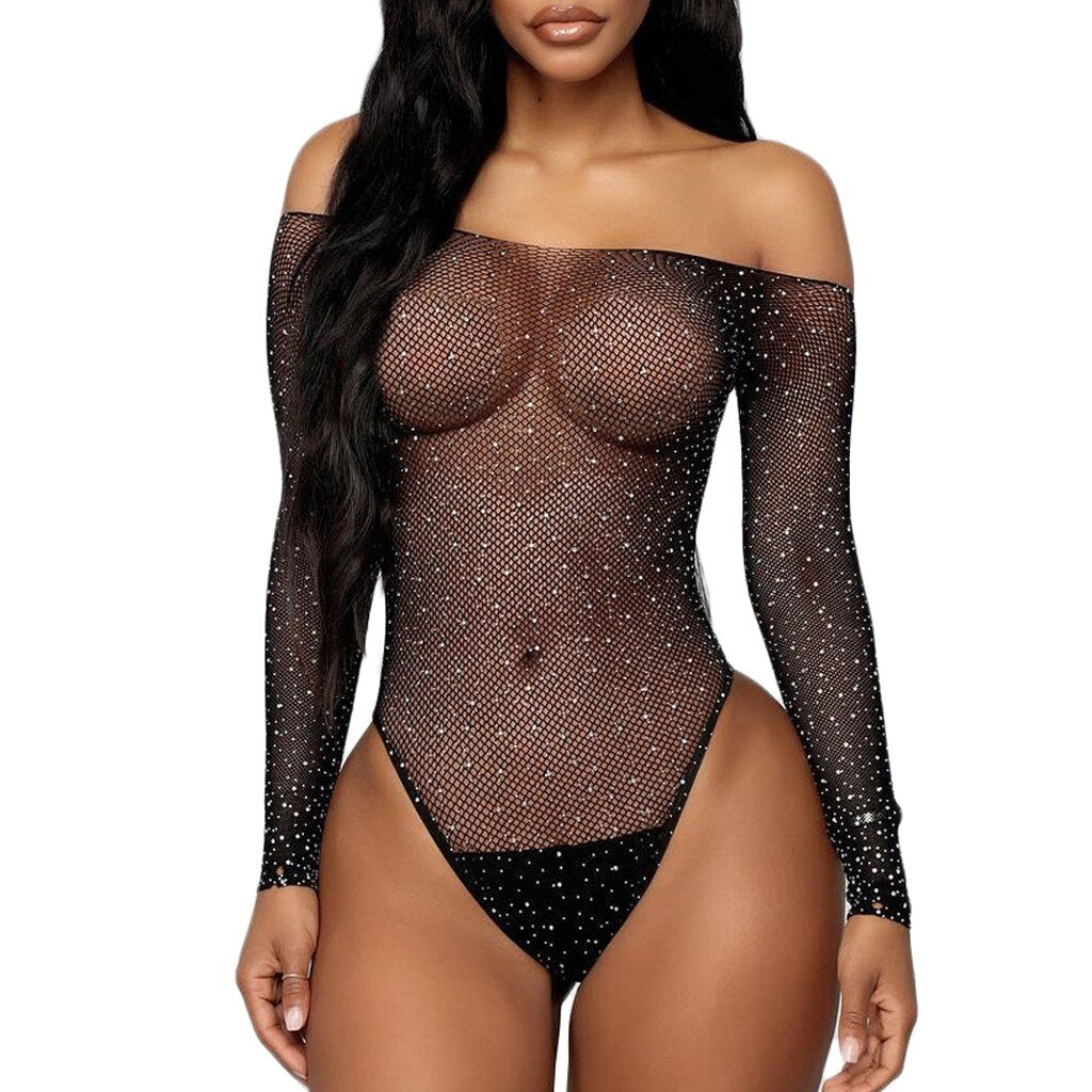 Women Teddies Black Lace Fishnet Rhinestone Lingerie Bodysuit Off- Shouder Jumpsuit Bodystocking Sexy Lingerie Catsuit 2021