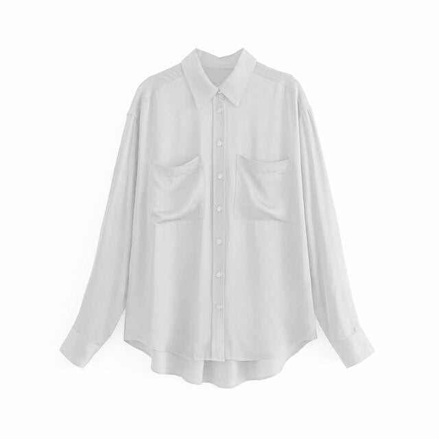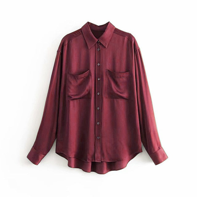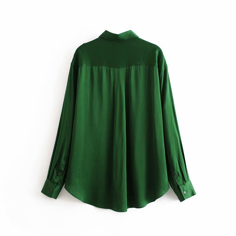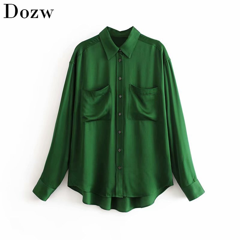 Women Vintage Satin Blouse Casual Solid Shirt 2019 Soft Turn Down Collar Office Shirt Long Sleeve Pocket Green Blouse Top Blusas