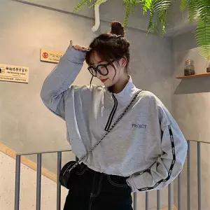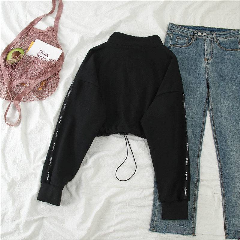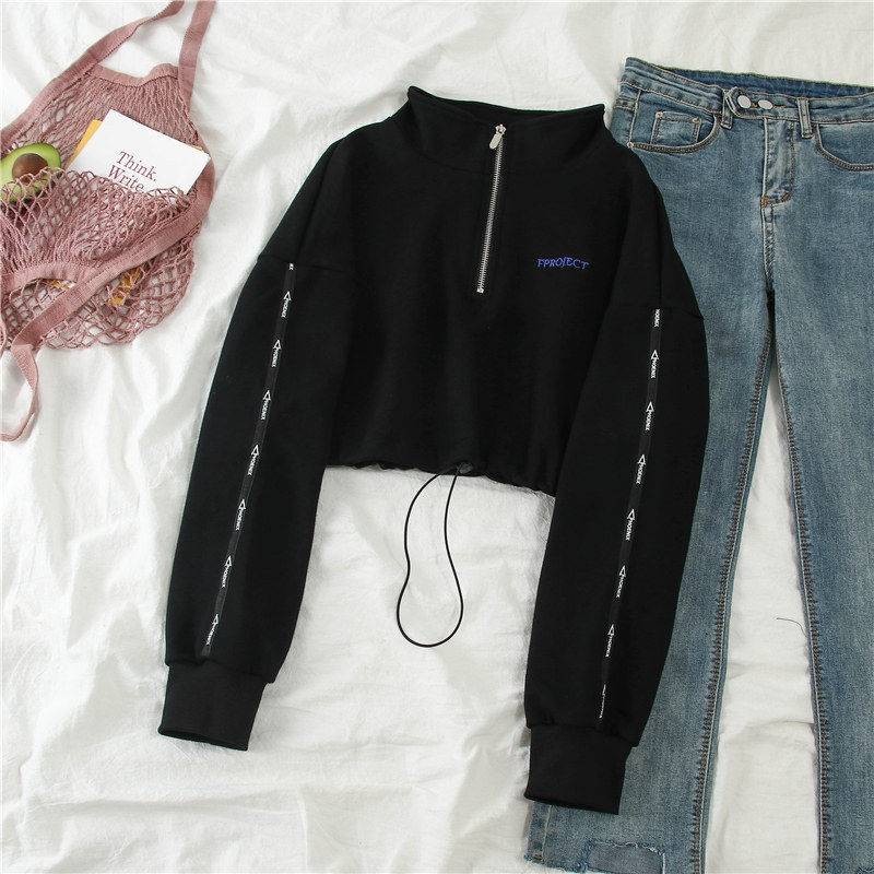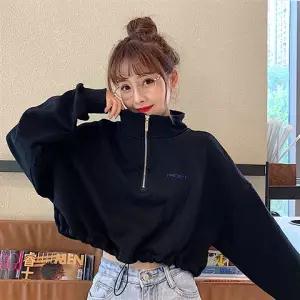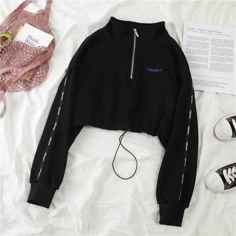 Women Zipper Autumn Black Solid Hoodies Cropped Streetwear Long Sleeve Sweatshirt Cool Loose Pullover High Street Hoodie Females